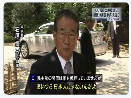 自分の考えと違うと発狂して、後で後悔するお爺さん=石原慎太郎 日本は敗戦で、国家主義を悔い、真面目に生きる証拠に「靖国政治利用」を完全禁止にした。復古趣味顔で靖国に腐乱参拝する者は、日本の再生を真摯に考えてみろ 日本人の魂を侮辱する石原慎太…